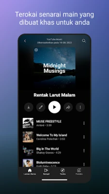 YouTube Music menghubungkan anda dengan dunia muzik yang luas. Temui persembahan langsung, nyanyian semula, adunan semula eksklusif, serta ribuan senarai main terpilih. Nikmati muzik diperibadikan untuk setiap saat, termasuk adunan semula aktiviti khas untuk Senaman, Santai dan Fokus anda. Teroka dan cari muzik baharu setiap hari.